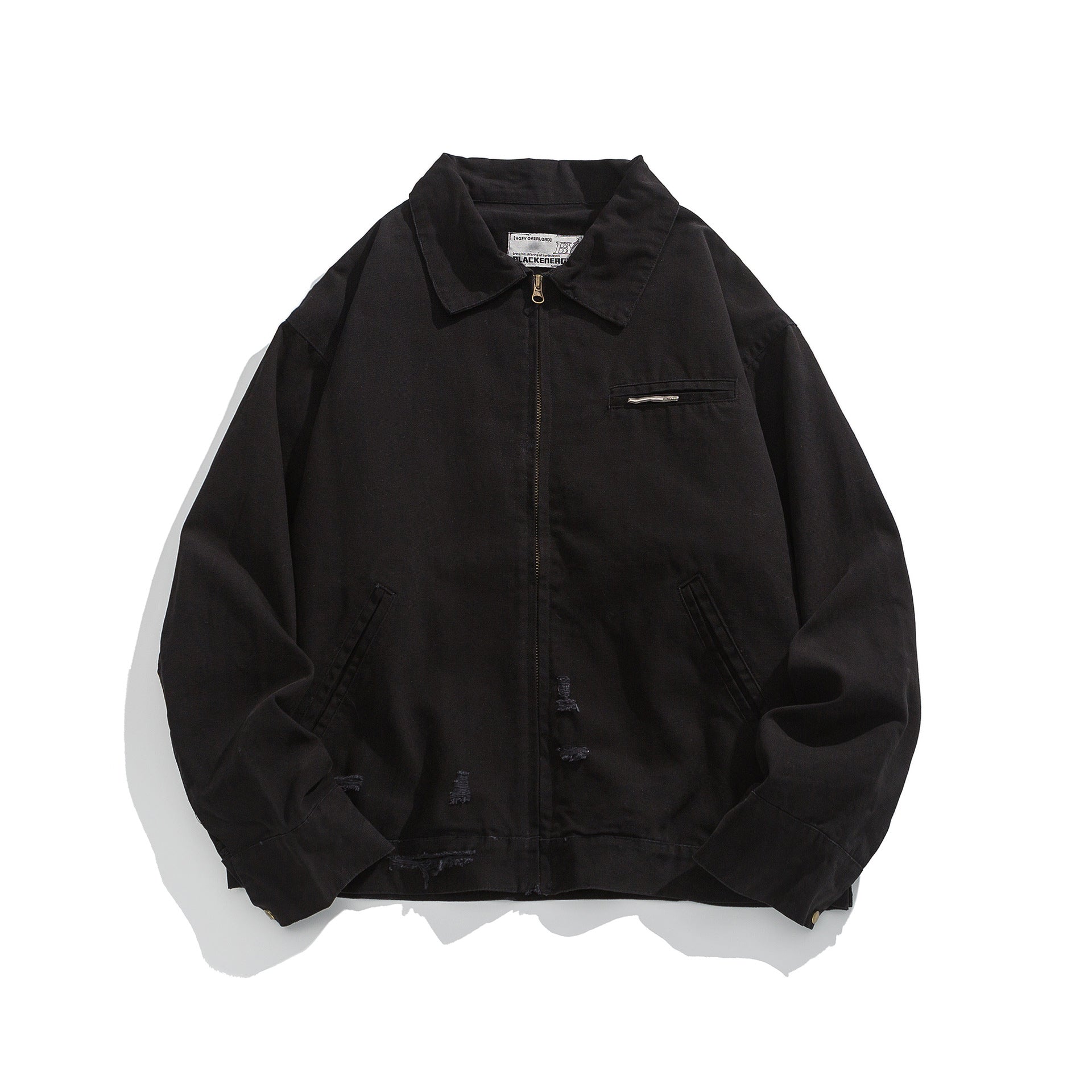 Vintage-style cotton canvas jacket with handmade distressed details. Flip collar with loose fit and zip closure. Durable construction with authentic workwear appeal.