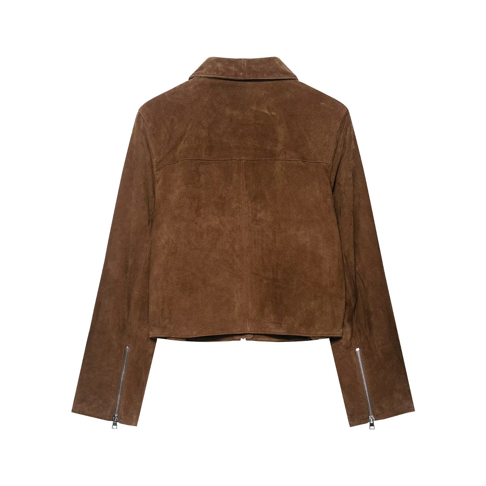 Polyester jacket with leather finish. Flip collar with straight cut and zip closure. Features collage and splicing details.